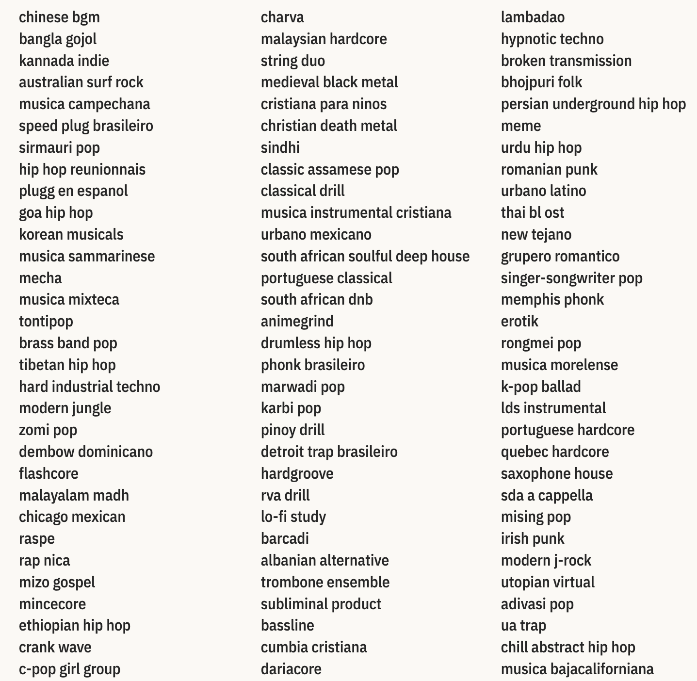 And finally, the essay links to a public Google Doc documenting 2,953 genres in Spotify’s system.
