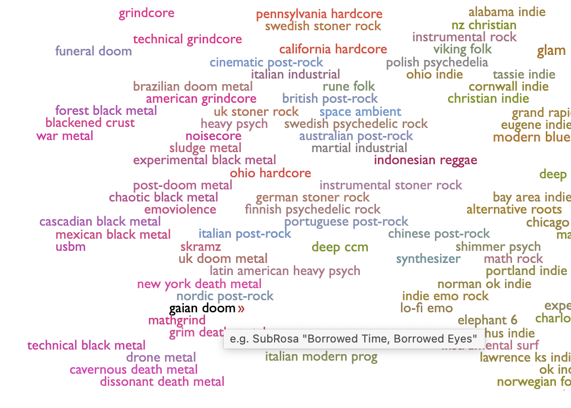 GM: “Named” is a fuzzy distinction. Technically speaking, every genre name on the map was picked by one of the humans working on this project. Most of the time, that “picking” is just reflecting the existing name from the outside world.