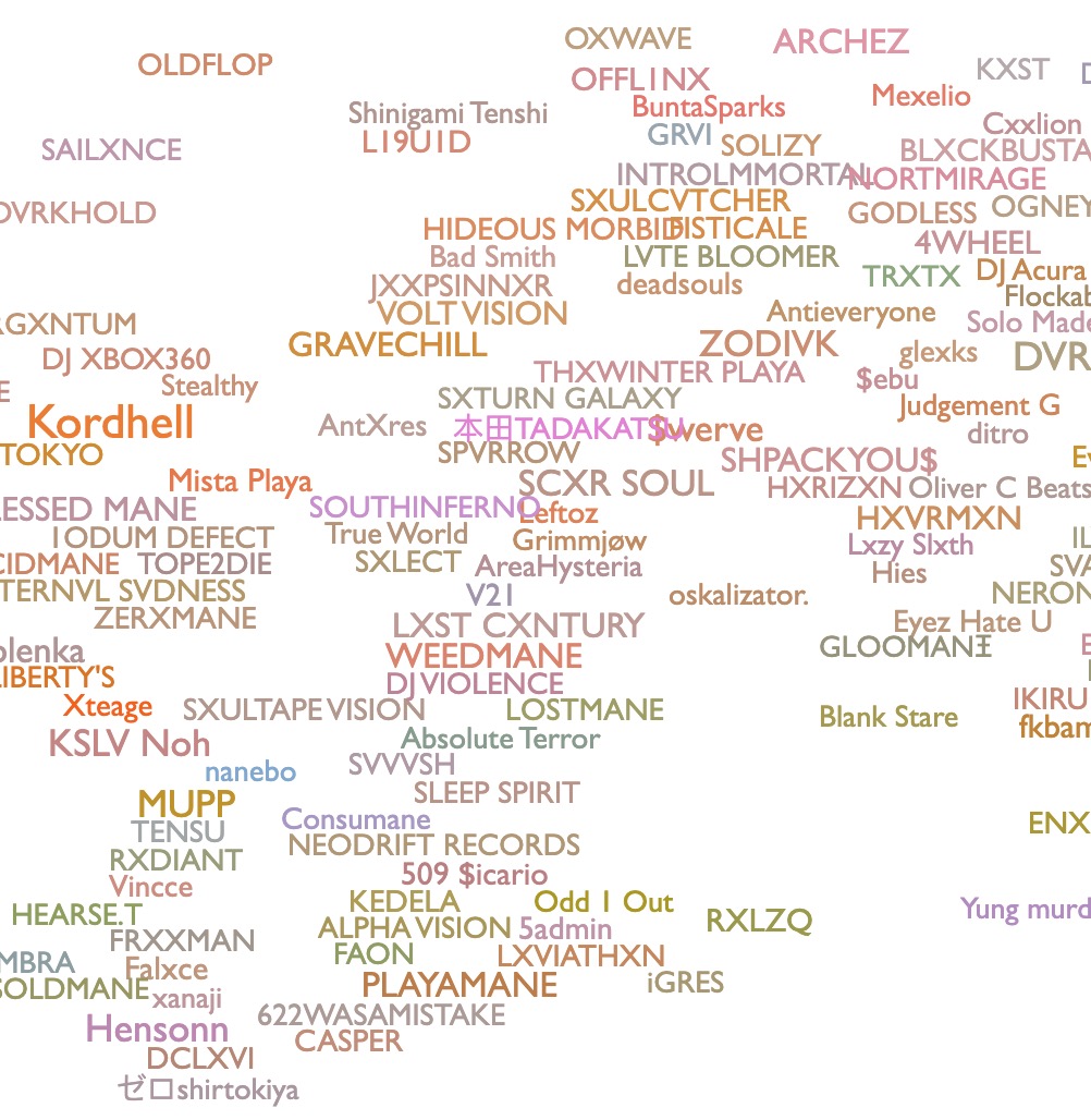 Every Noise at Once is maintained by Glenn McDonald, who, until recently, served as Spotify’s “data alchemist.” Regardless of how you feel about Spotify, this “map” assuredly represents a remarkable navigational tool for anyone navigating the teeming oceanic ecosystem of contemporary recorded sound. There are innumerable ways to dig deeper into the data, but two immediately enticing things are: (1) you can click on any point in the map and instantly hear a representative sample of the genre, and (2) you can click on a tiny arrow and get a map of the artists associated with the genre. Here, for instance, is the cluster of artists that comes up for “drift phonk,” a genre, per Wikipedia, associated with social media videos of drifting street racing cars: