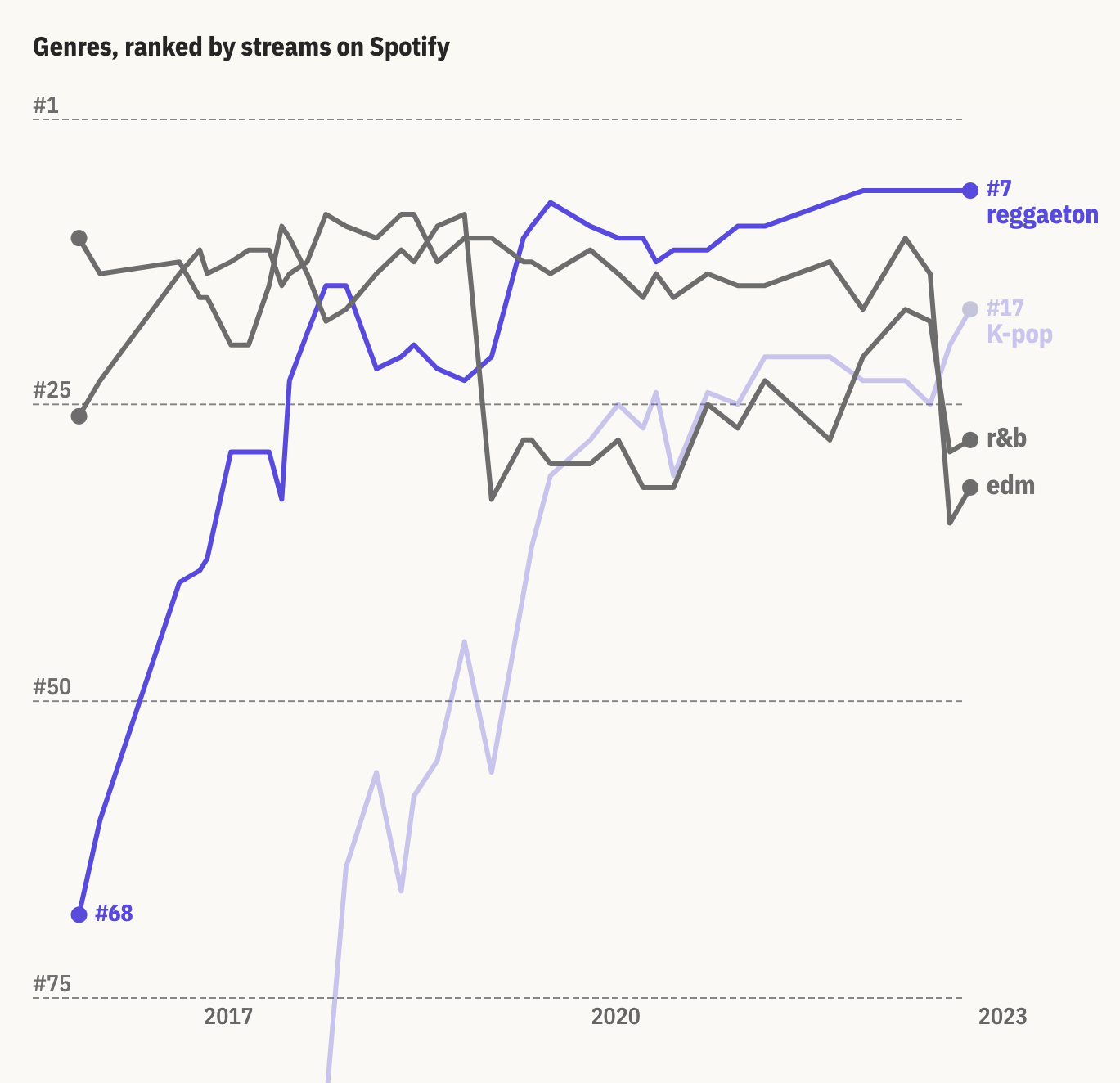 A few months ago, I came upon a visual essay at visual-essay site the Pudding about how Spotify manages genres. It begins by looking at differences in the 25 most popular genres on Spotify between 2023 and 2016 (the year Spotify first published a list of its most popular genres). The authors look at certain genres and offer some thoughtful analysis about why these genres might be rising or falling in Spotify’s metrics.