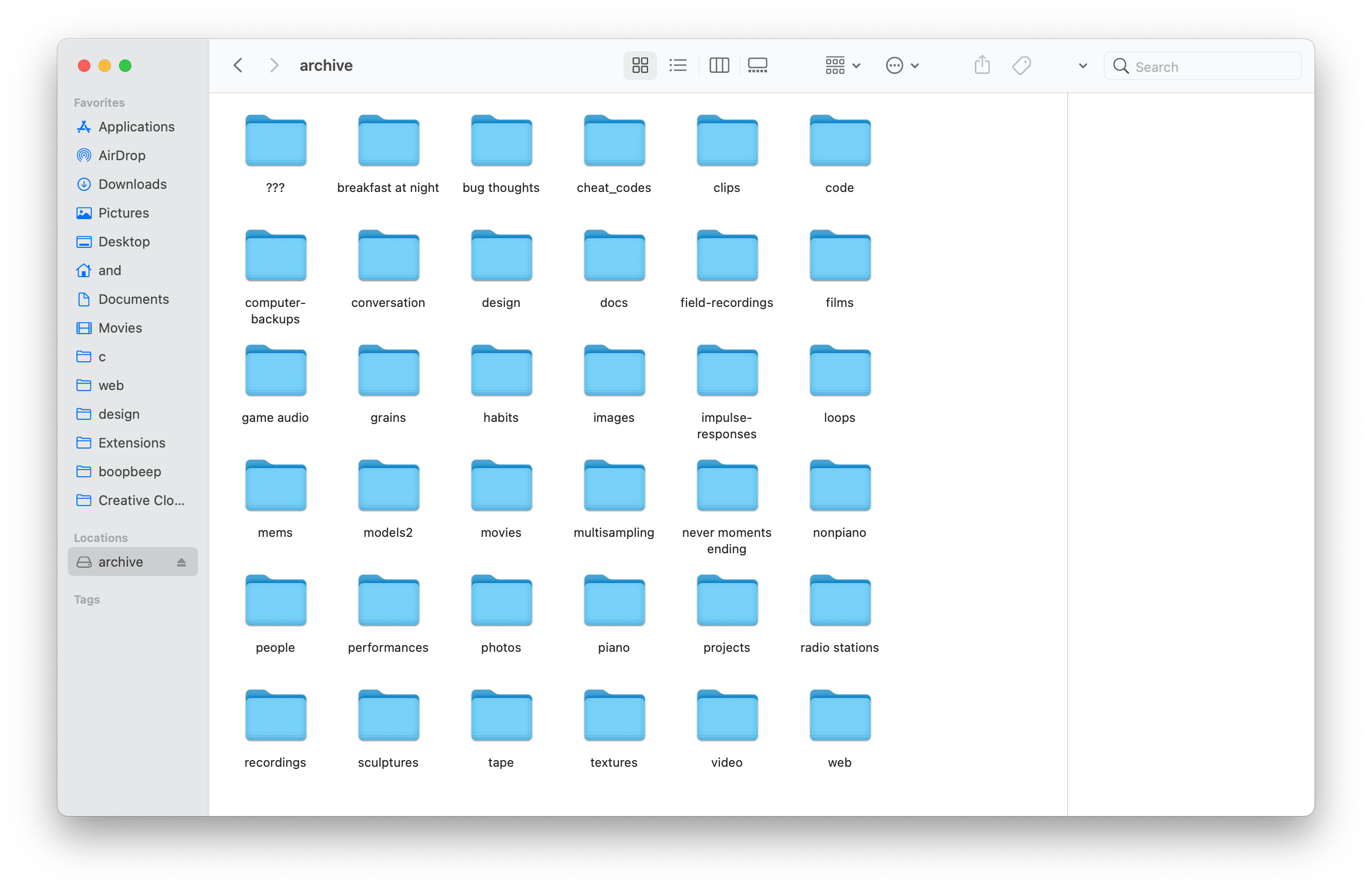 So with regard to the twinned archives — do you have a visual archive that mirrors the sonic one? Like one for photography and one for recordings? Or do you seem them all as part of a single big “life archive?” This is the part where I want to see how your documents folders are organized.