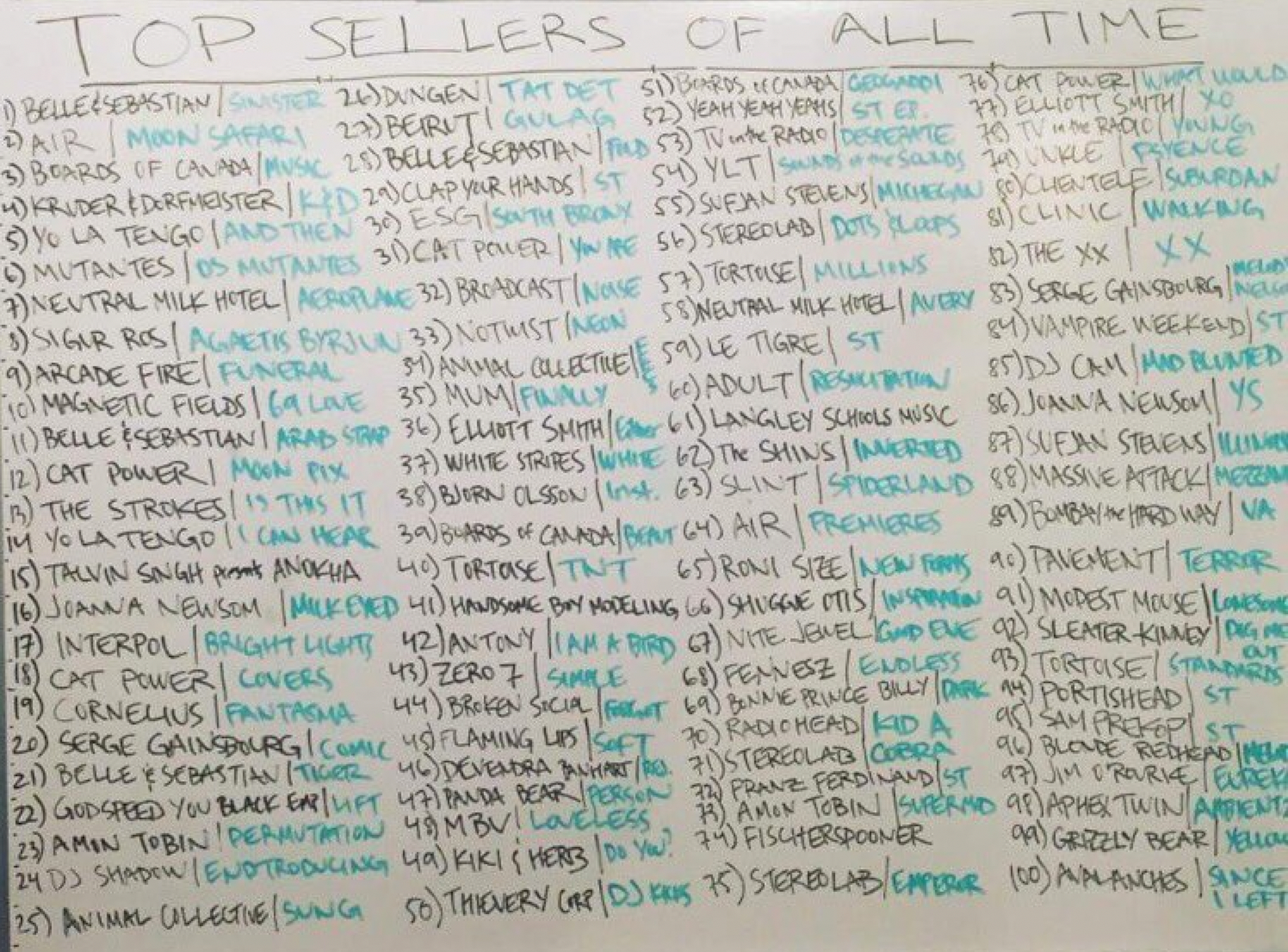 It’s not like I’ve never tried doing this before. Recently I’ve made some attempts to build up my sense of historical context in a few key areas (I made a dedicated dive into the Penguin Jazz Core Collection a few years back) but in the depths of the card index there are literally hundreds of albums that crossed my radar in some way or another, got jotted down as a note, but then subsequently went uninvestigated. Just for instance, I once filed away this photograph of Other Music’s all time top sellers. I’ve heard a lot of what’s on here, but probably not more than half: